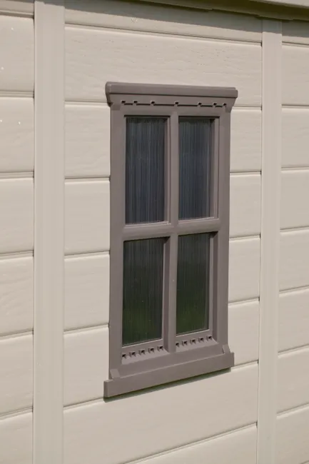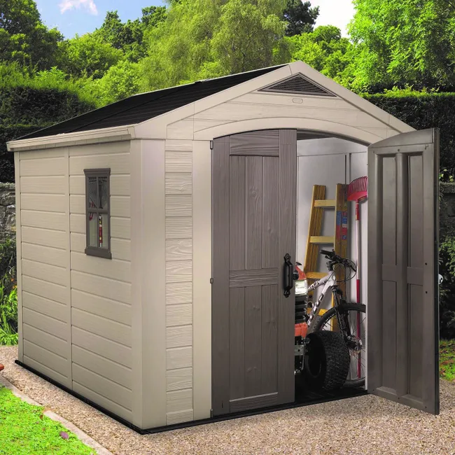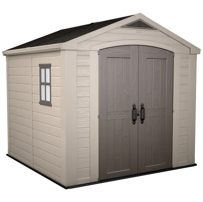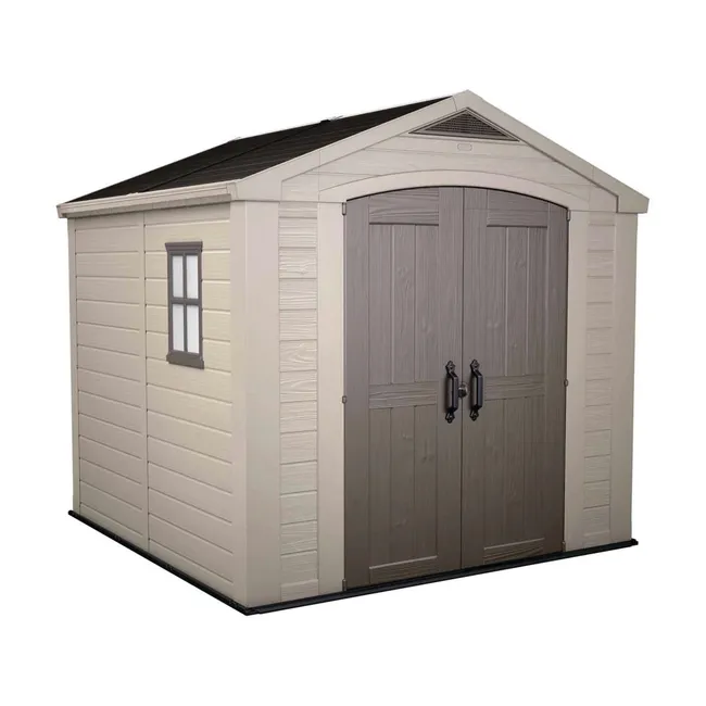 Casetta da giardino realizzata con struttura realizzata a pannelli a doppia parete con rinforzi in metallo e copertura in polipropilene, color tortora. Dispone di un’ampia entrata centrale a 2 porte con chiusura lucchettabile, un ampio lucernario a soffitto e una finestra laterale. La casetta comprende pavimentazione, 2 mensole ed è dotata di fori di ventilazione. Dimensioni: L 256.5 x P 255 cm, altezza del colmo: 243 cm.