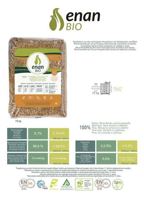 ENAN bio – Pallet di 70 Sacchi di Pellet di 15 Chili EN Plus A1 (1050kg). Consegna a Domicilio