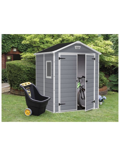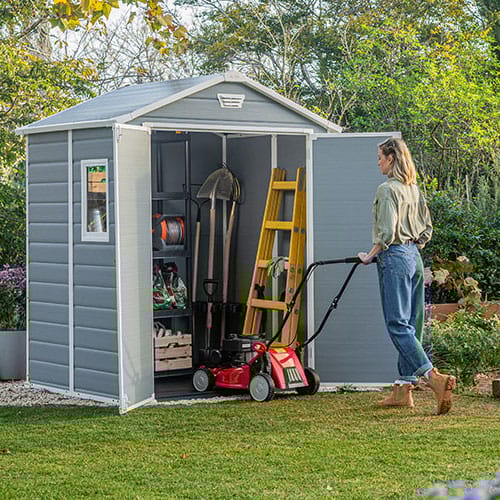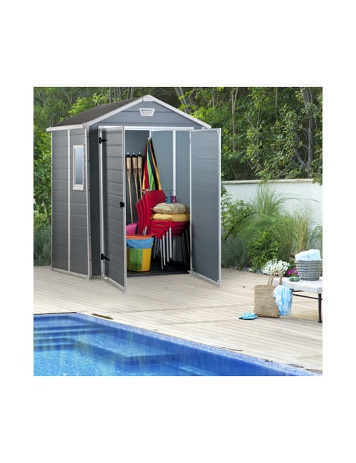 Mantieni pulito e in ordine il tuo giardino con Manor 6×5, casetta di medie dimensioni dotata di una struttura con pannelli a doppia parete resistente agli agenti atmosferici (eccetto gli eventi climatici più estremi), di un pavimento che mantiene il contenuto della casetta asciutto e pulito, di una porta a due ante per un accesso facilitato anche agli oggetti di grandi dimensioni, di fori di ventilazione e di una chiusura lucchettabile.