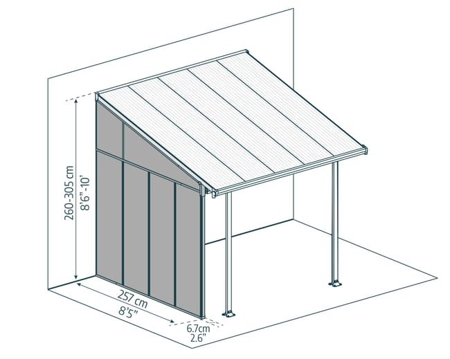 La parete laterale ingegnosa e pratica si collega al vostro Palram – Canopia 3M profondità Patio Cover su uno o entrambi i lati fornendo protezione dal vento e migliorando la vostra esperienza di tempo libero all’aperto. La parete laterale in acrilico cristallino ad alto impatto è semplice e facile da installare. È estetico, resiliente, facile da pulire e mantiene un’alta trasmissione della luce per tutta la sua lunga durata. L’alluminio resistente alla corrosione abbinato alle lastre acriliche che bloccano naturalmente il 100% dei raggi UV dannosi, lo rende una meravigliosa aggiunta alla vostra copertura del patio. È progettato per integrarsi perfettamente con il design della vostra casa e l’ambiente esterno. • Alto impatto, cristallino, pannelli acrilici solidi naturalmente immuni ai raggi UV nocivi • Telaio in alluminio verniciato a polvere e resistente alla ruggine • Protezione durante giornate ventose • Riduzione del rumore ambientale per una maggiore privacy • La parete laterale SideWall può essere installata su uno o entrambi i lati • Compatibile con tutte le dimensioni di Palram – Canopia 3M profondità coperture patio • Installazione semplice e facile – nessun attrezzo speciale richiesto • Non richiede manutenzione