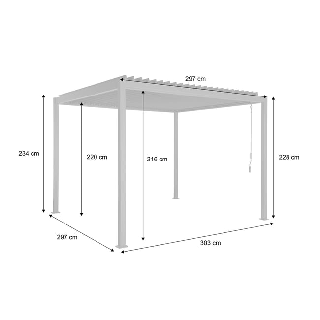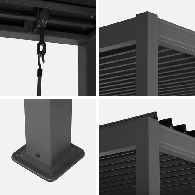 Passate momenti piacevoli e conviviali nel vostro giardino grazie alla pergola bioclimatica Flash 3 x 3 m. Questa pergola ha la specificità di adattarsi al meteo. Vi protegge dalla pioggia in inverno e vi permette di godere del sole in estate e di apprezzare la sua ombra e freschezza. La pergola è un’installazione permanente perché deve essere fissata al suolo. Non c’è bisogno di riporla in inverno, potrete goderne tutto l’anno. Grazie al suo design leggero ed elegante, porterà una nota di modernità nel vostro giardino. Con le sue dimensioni, troverà facilmente il suo posto sopra un tavolo da giardino, una SPA o vicino alla piscina. Una struttura solida in alluminio e acciaio La pergola è realizzata con materiali solidi. L’incorniciatura del tetto e i piedi sono in alluminio, il quale ha il vantaggio di non arrugginire e di resistere agli agenti atmosferici e ai raggi UV. Le lame orientabili e i caps in basso ai piedi sono in acciaio galvanizzato. Questo trattamento limita l’apparizione di ruggine. Per una tenuta ottimale nel tempo, basterà trattare le zone con un prodotto antiruggine adatto. Ombra, sole e ventilazione: a voi la scelta! Il tendalino può aprirsi e chiudersi grazie alle sue lamelle inclinabili che si azionano tramite una manovella. Completamente chiusa, offre una protezione totale dal sole grazie alle sue lamelle isolanti e alla sua massima oscurazione. Questa pergola resiste all’acqua ed è dotata di un sistema di drenaggio integrato innovativo che permette l’evacuazione dell’acqua attraverso i pilastri. Le lame orientabili consentono una ventilazione naturale, leggera rimanendo protetti dal sole. Consentono anche di regolare il flusso luminoso dei raggi del sole. Informazioni aggiuntive: Sebbene offra una protezione dalla pioggia, questa pergola non è un riparo completamente impermeabile. Questa pergola è da montare su un terreno livellato Per il trasporto, alcune parti della struttura sono riposte nei piedi È consigliato mantenere le lame aperte in caso di nevicata Devo fare una dichiarazione per la mia pergola bioclimatica?